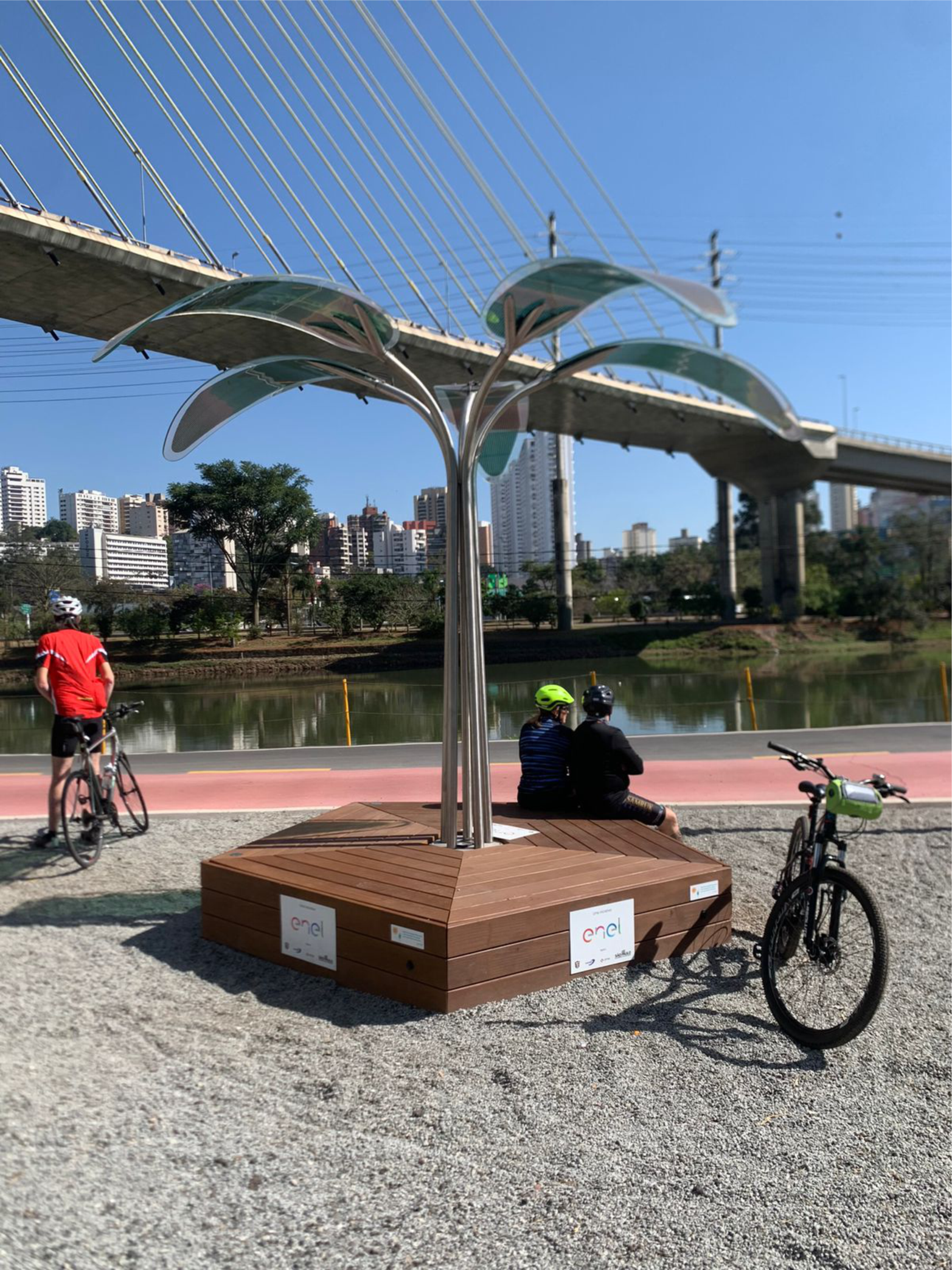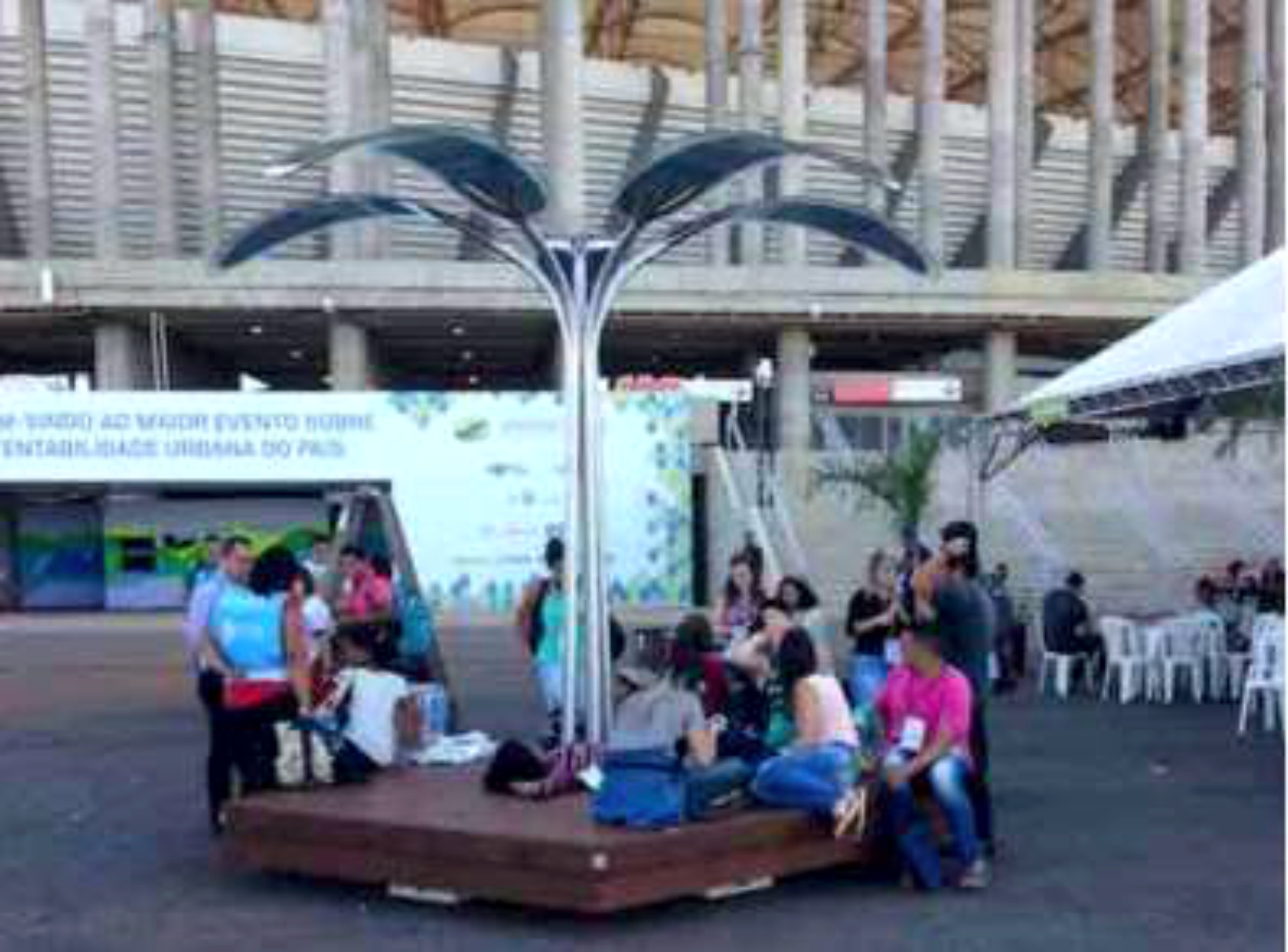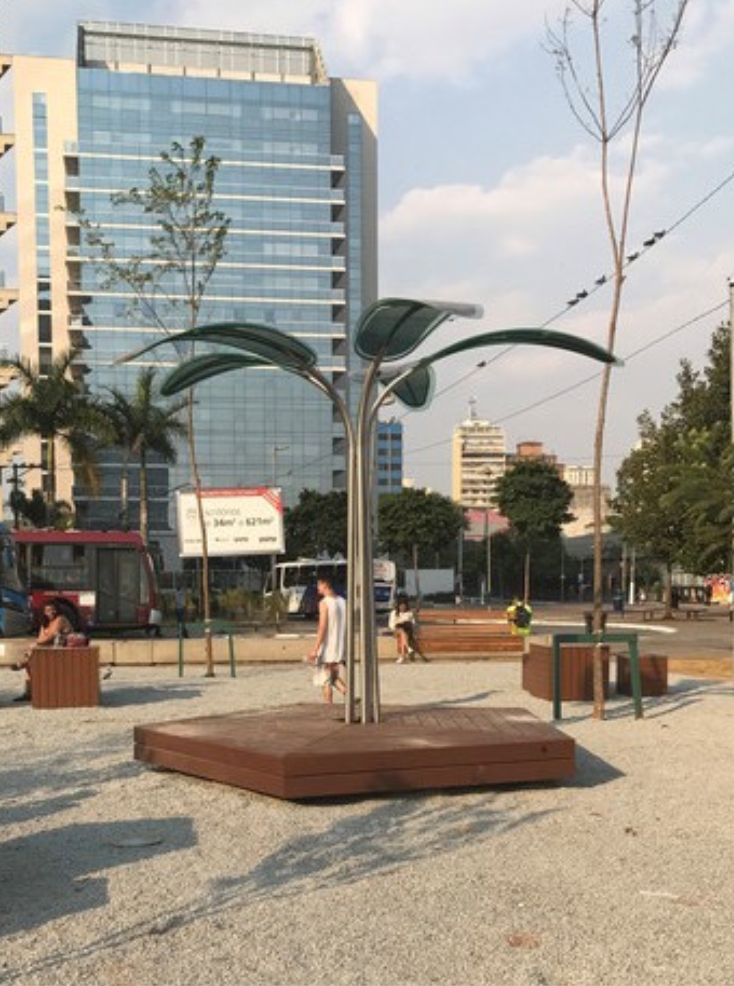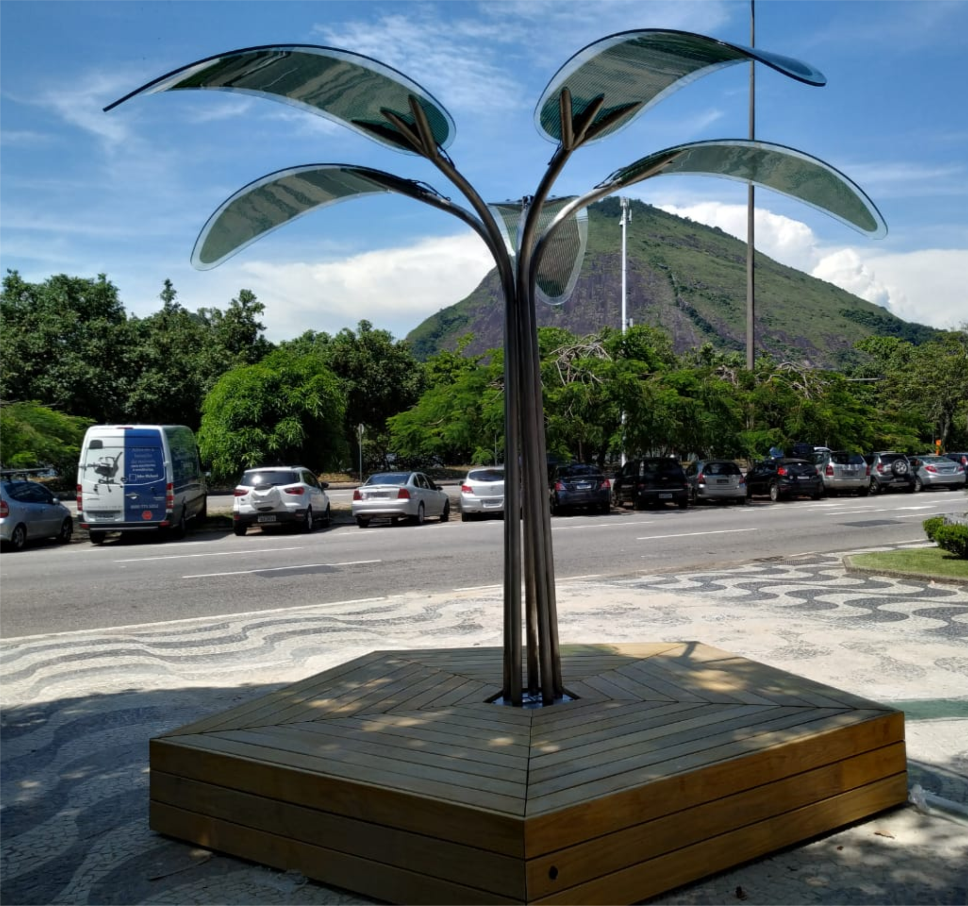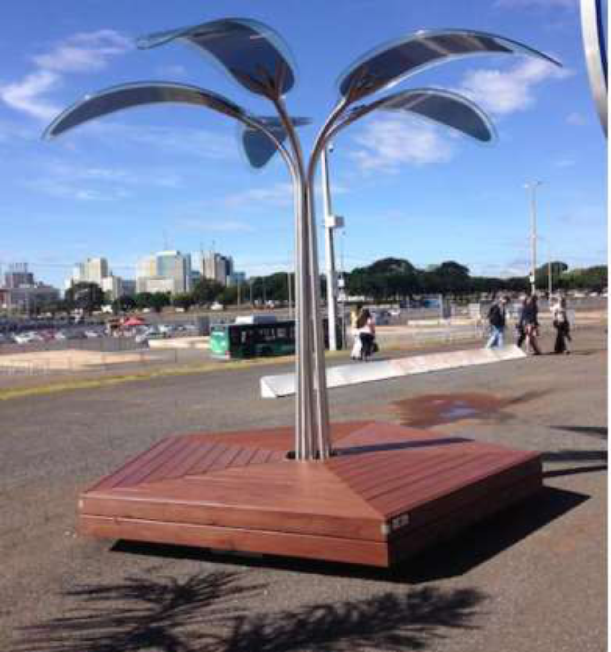 O mobiliário urbano em forma de árvore, cujas folhas são feitas com Filmes Fotovoltaicos Orgânicos, tem um desenho moderno que otimiza a captação de energia solar, pelos painéis.
