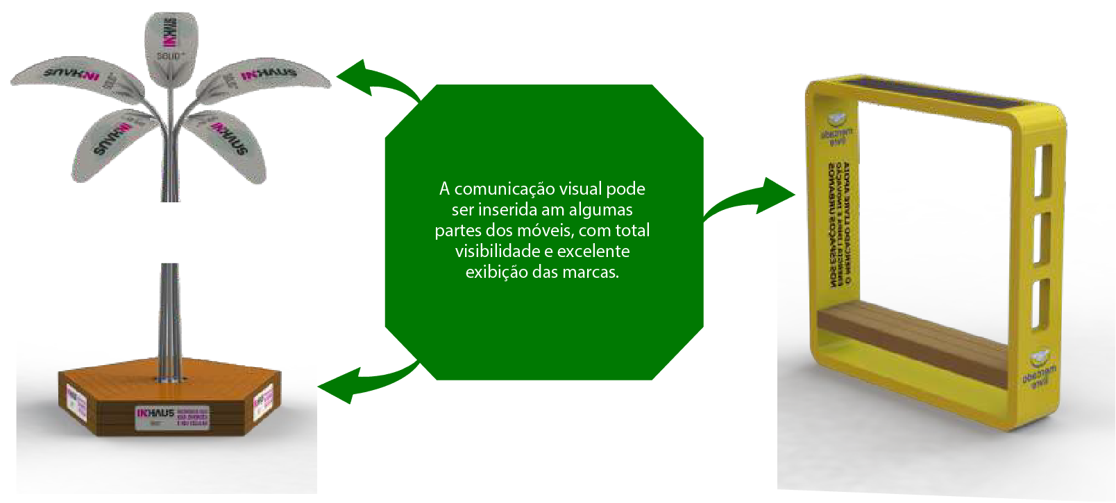 Além é claro do banco gerar energia através da luz solar, que pode ser usada para carregar equipamentos, fornecer energia para modens, roteadores, iluminação, etc, sua estrura é especialemente projetada para receber comunicação visual e publicidade. Seu design inovador permite a associação das marcas com o que há de mais moderno em geração de energia sustentável.