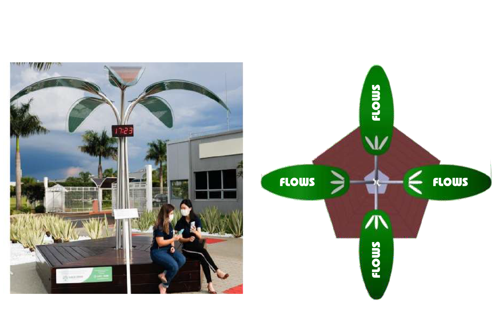 A OPTree é um mobiliário urbano, que vem revolucionando o uso do espaço das cidades A OPTreeTM combina design, inovação e sustentabilidade tendo em suas folhas com filme de OPV laminado em vidro, gera energia elétrica de forma independente e sustentável, possibilitando o carregamento de smartphones por meios de entradas USB e energia para a iluminação.
