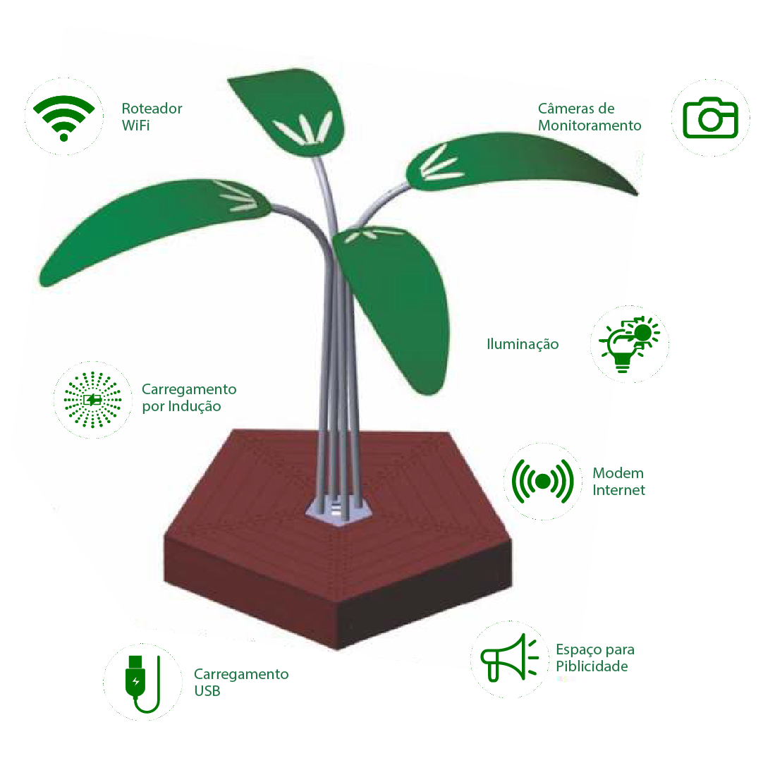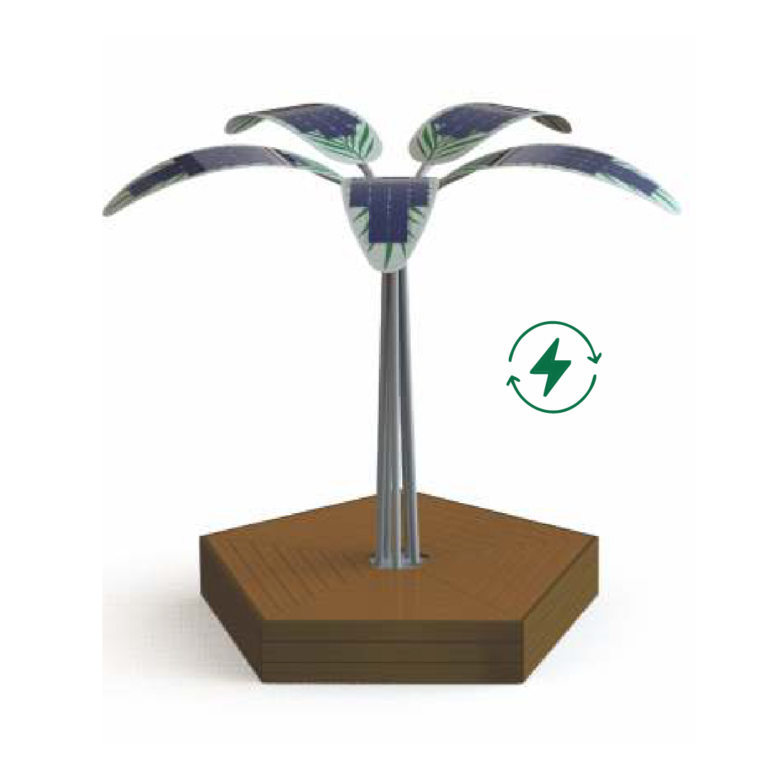A OPTree é um mobiliário urbano, que vem revolucionando o uso do espaço das cidades A OPTreeTM combina design, inovação e sustentabilidade tendo em suas folhas com filme de OPV laminado em vidro, gera energia elétrica de forma independente e sustentável, possibilitando o carregamento de smartphones por meios de entradas USB e energia para a iluminação.